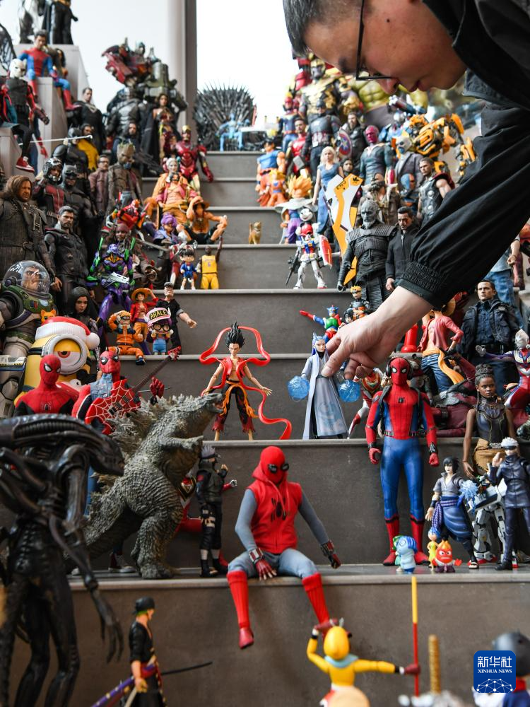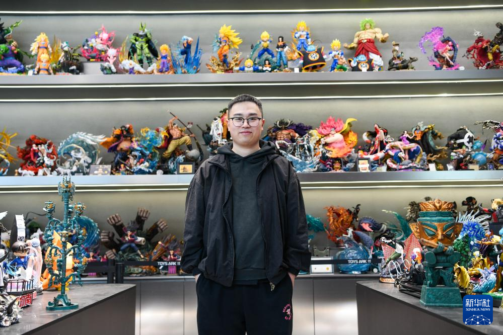 3月1日,在成都天府国际动漫城,曾舟在店里给前来参观的小朋友讲解各类收藏的潮玩手办。
