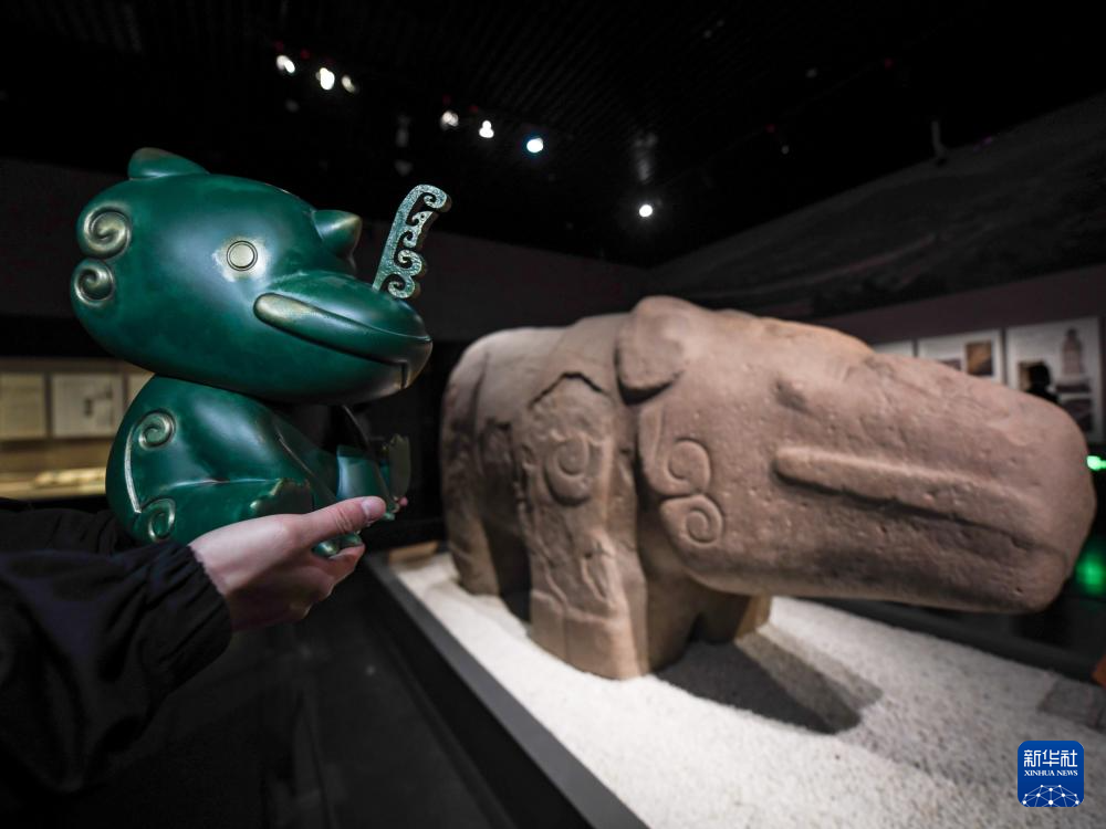 在成都博物馆,曾舟将自己设计的文创产品与镇水石犀文物原型合影(2022年5月17日摄)。