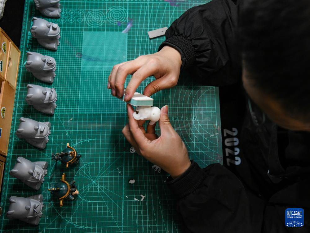 3月1日,曾舟在工作间打磨文创产品模型。