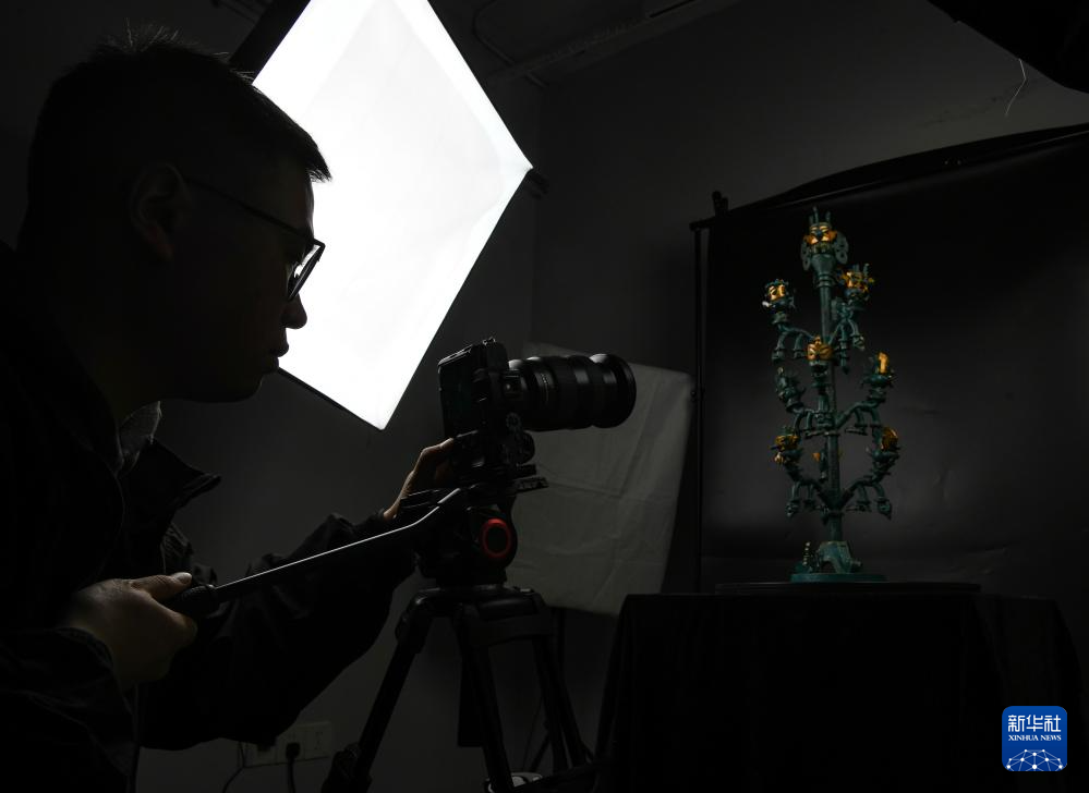 3月1日,在成都天府国际动漫城,曾舟在自己开的店铺内的摄影室为三星堆青铜神树文创产品拍摄视频。
