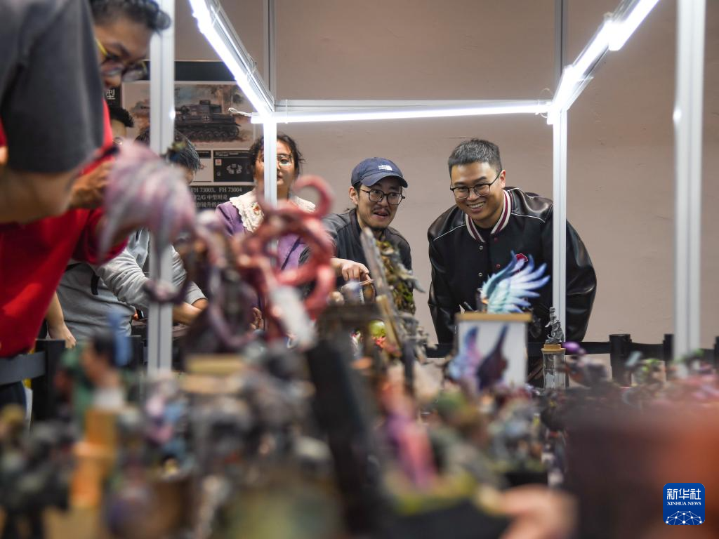 在成都天府国际动漫城,曾舟(右)和前来参加静态模型创意大赛活动的选手交流(2024年10月26日摄)。