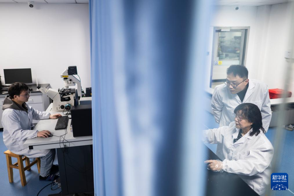 在华中农业大学,金梅林(右一)指导学生进行双荧光素酶活性测定(3月2日摄)。