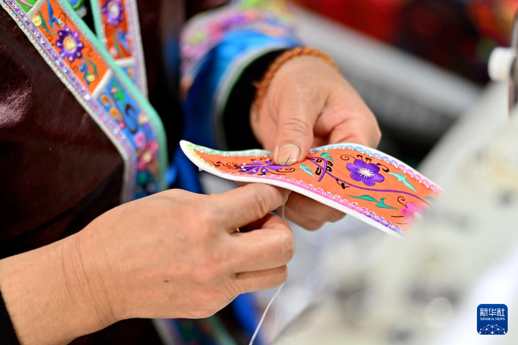 在广西柳州市融水苗族自治县杆洞乡杆洞村,杨洪英(右)在苗衣制作基地工作(2月27日摄)。