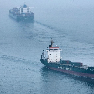 3月4日,在钦州茅尾海上,海轮往来穿行转运钦州港码头货物(无人机照片)。