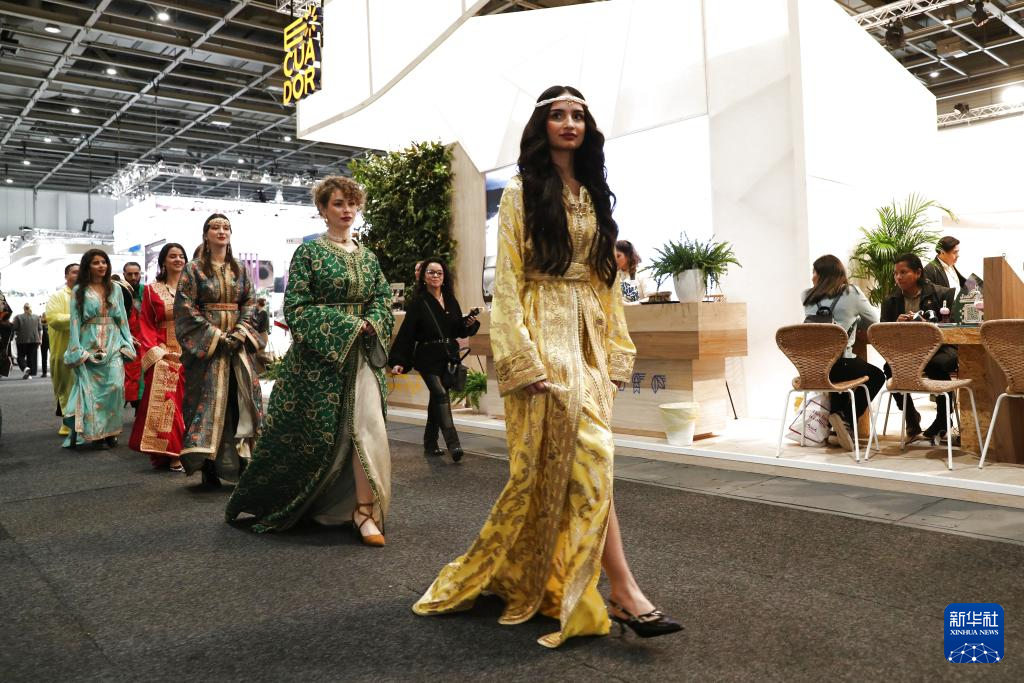 3月4日,在德国首都柏林举行的2025柏林国际旅游交易会上,身穿摩洛哥传统民族服饰的模特走在展厅内。