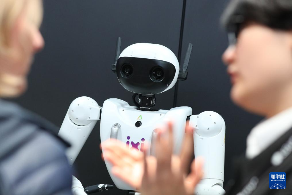3月5日,人们在西班牙巴塞罗那举行的2025年世界移动通信大会上同机器人(左)互动。