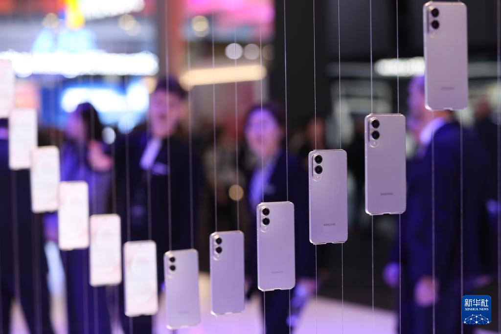 3月5日,人们在西班牙巴塞罗那举行的2025年世界移动通信大会上参观三星品牌手机。
