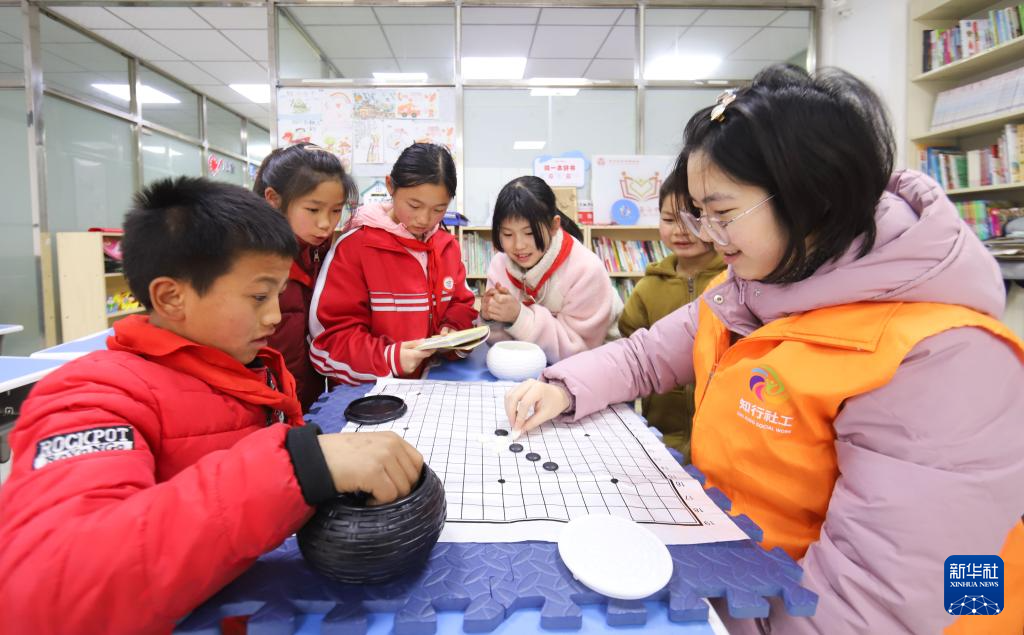 3月5日,在贵州省开阳县紫兴街道蒋家寨易地扶贫搬迁安置点,志愿者在“四点半课堂”和学生下五子棋。