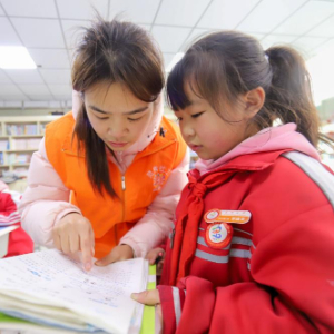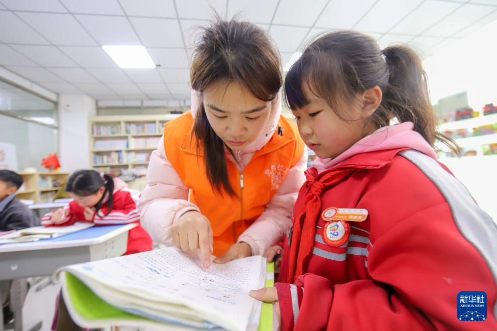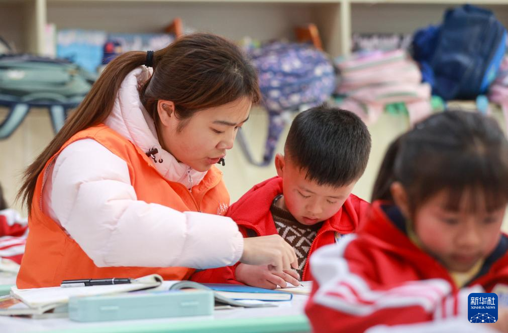 3月5日,在贵州省开阳县紫兴街道蒋家寨易地扶贫搬迁安置点,志愿者在“四点半课堂”给学生辅导作业。