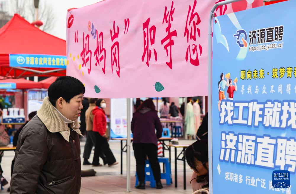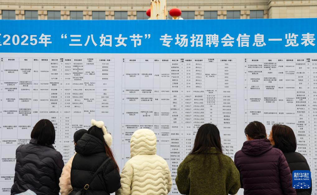 3月7日,求职者在河南省济源市举办的女性专场招聘会上了解岗位信息。