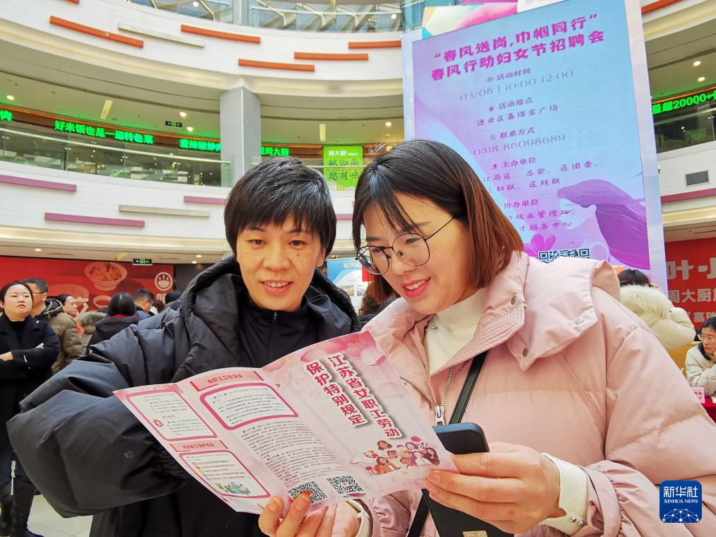 3月6日,女性求职者在江苏省连云港市连云区举办的女性专场招聘会上了解岗位信息。