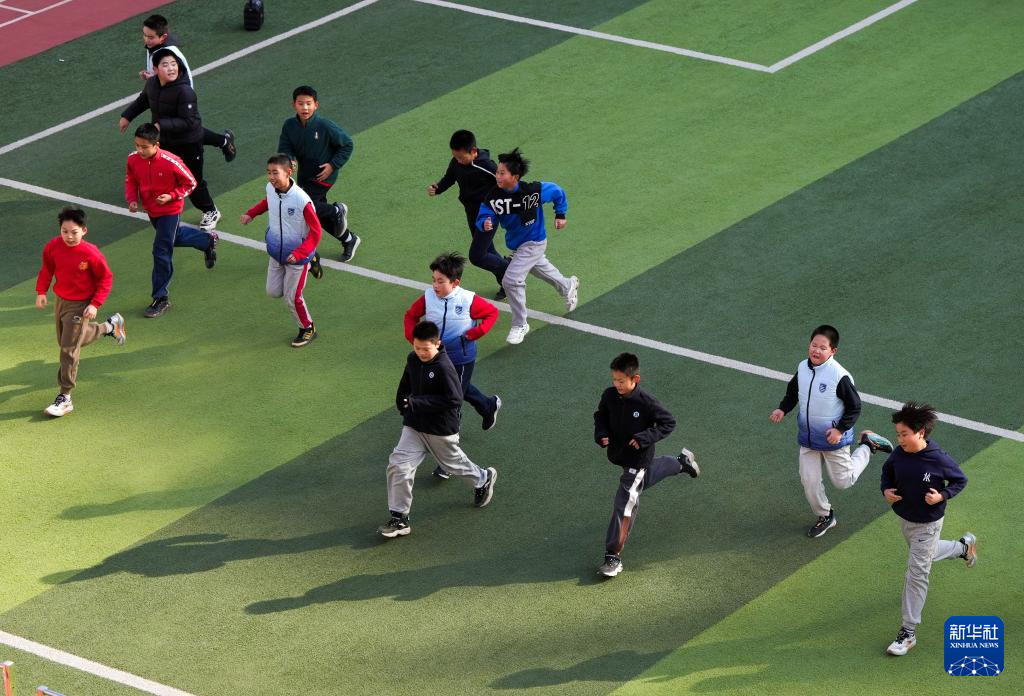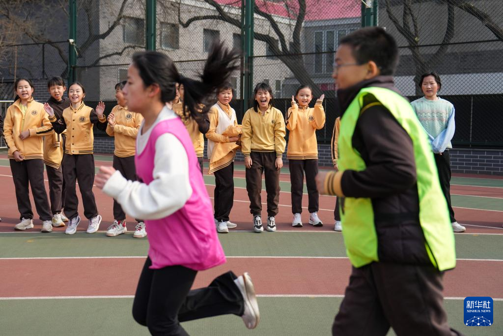 在北京第二实验小学,学生在体育课上进行1000米跑“班级赛”(3月5日摄)。