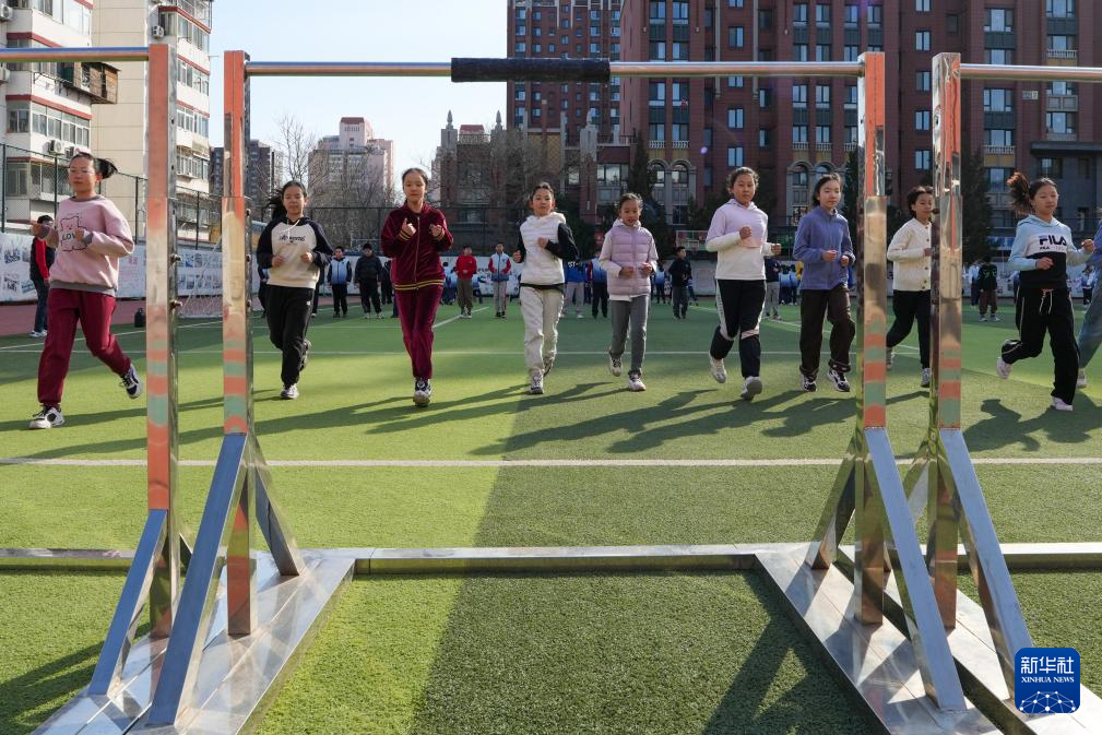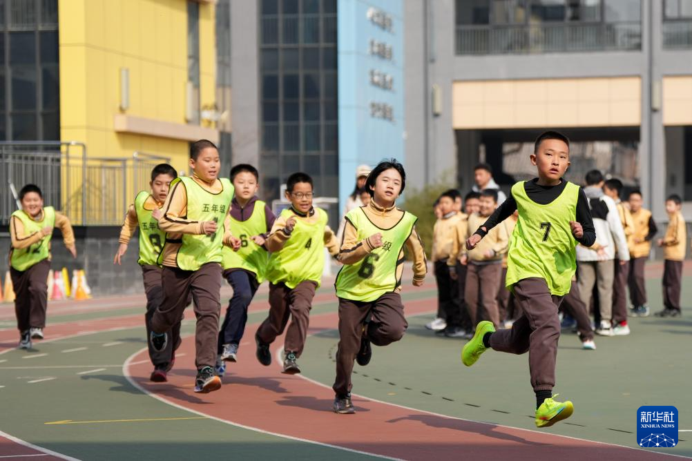 在北京第二实验小学,学生在体育课上进行800米跑“班级赛”(3月5日摄)。