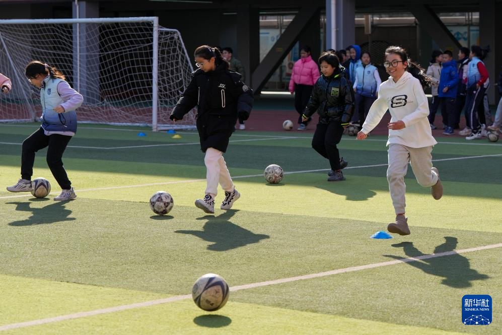 在北京市宣武师范学校附属第一小学,学生在体育课上踢足球(2月21日摄)。