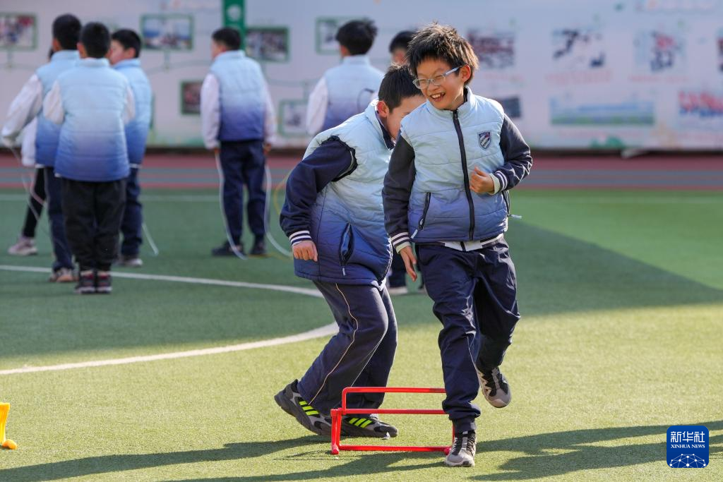 在北京市宣武师范学校附属第一小学,学生在体育课上跑步热身(2月21日摄)。