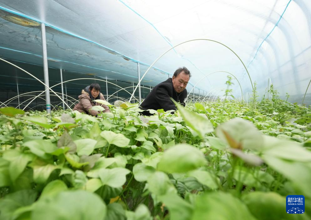 3月7日,在河北省行唐县南桥镇东安太庄村,一家红薯种植合作社的社员在扩繁大棚内栽植脱毒红薯秧苗。