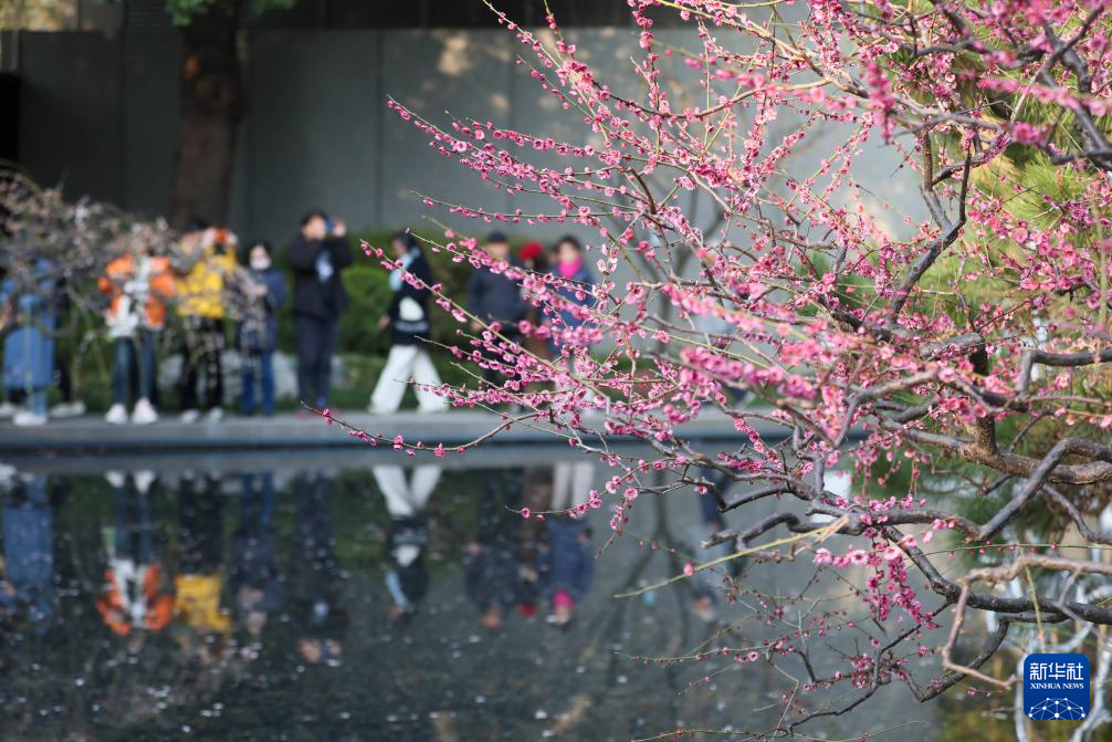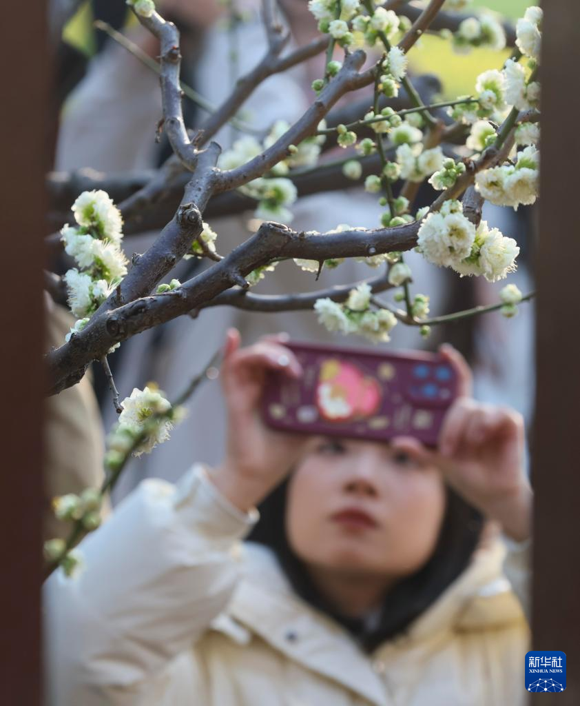 3月8日,人们在上海静安雕塑公园观赏梅花。