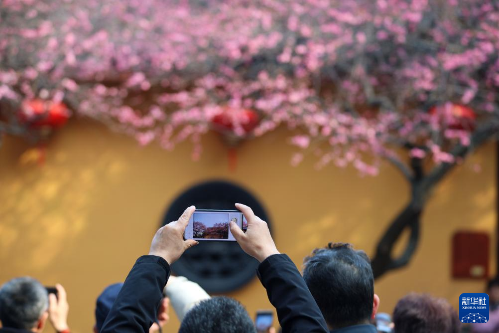 3月8日,游客在浙江省湖州市铁佛寺赏花游玩。