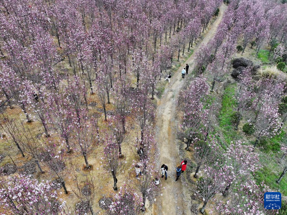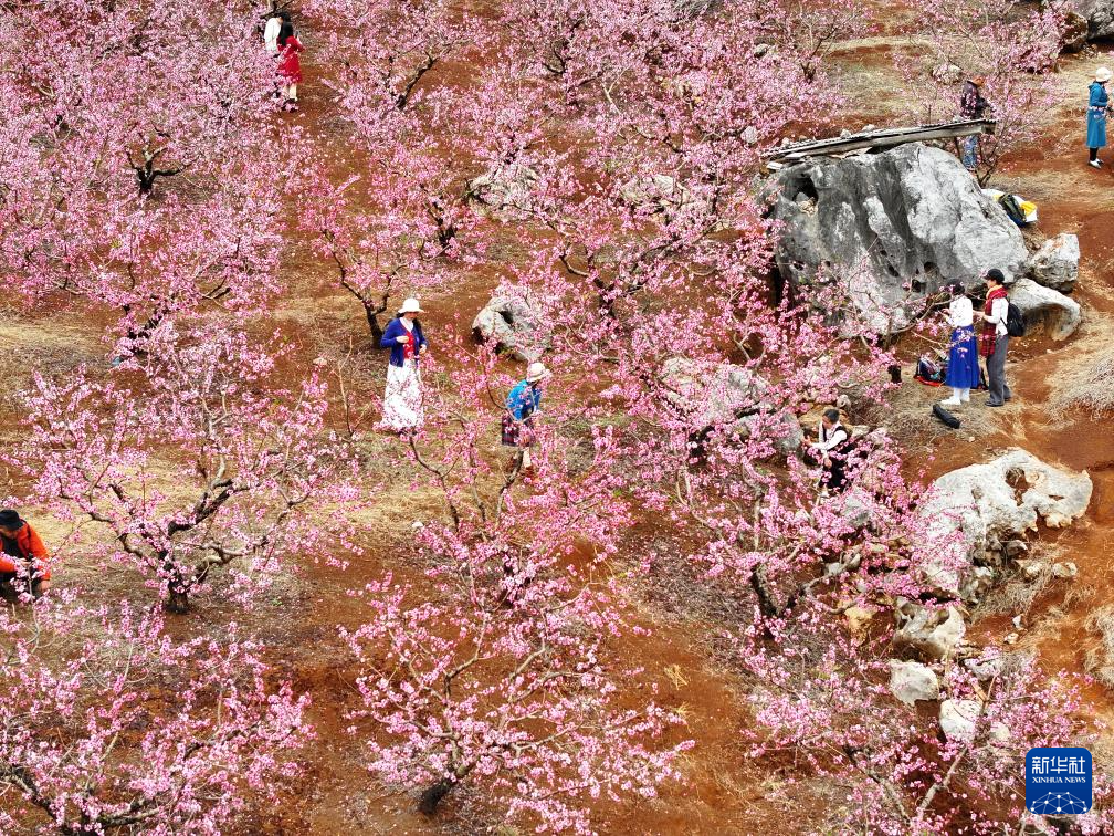 3月7日,游客在重庆市酉阳土家族苗族自治县桃花源景区踏青赏花(无人机照片)。