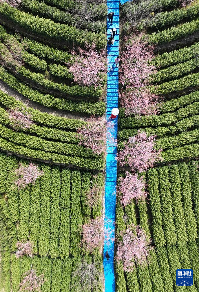 3月8日,游客在浙江省乐清市岭底乡九龙茶山游玩赏花(无人机照片)。