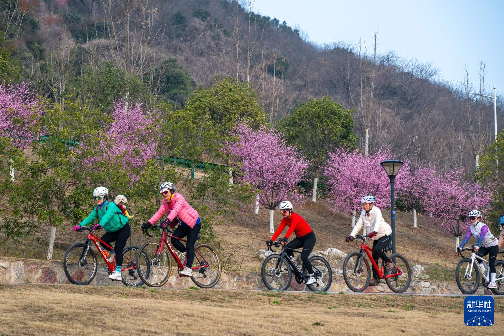 3月8日,在安徽省芜湖市繁昌区峨山镇,骑行爱好者在春花相伴下骑行。