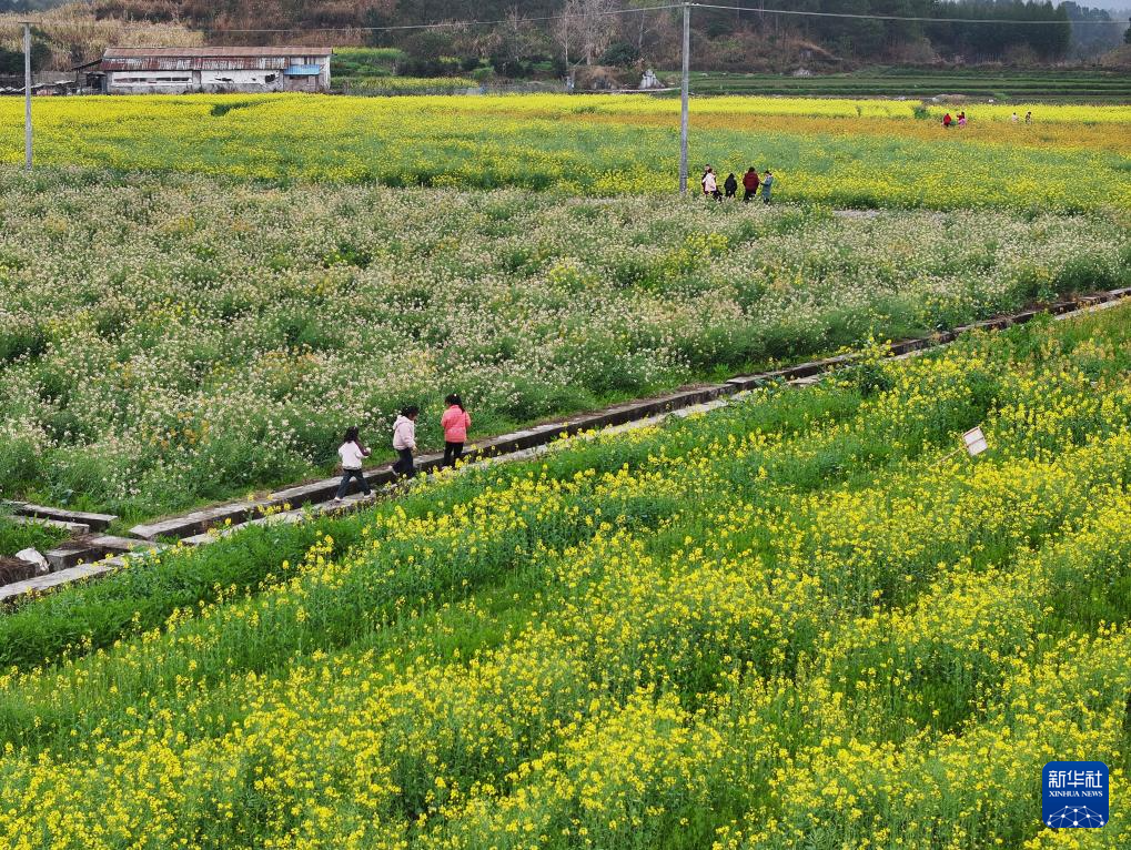 3月8日,游客在广西恭城瑶族自治县栗木镇观赏油菜花。