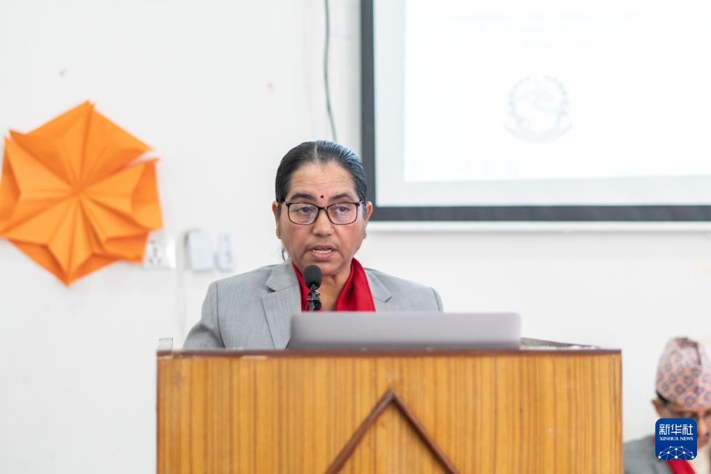 3月7日,在尼泊尔加德满都,尼泊尔联邦议会联邦院副主席碧玛拉·吉米雷在捐赠仪式上致辞。