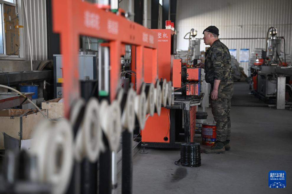 3月8日,工人在内蒙古兴安盟扎赉特旗内蒙古鑫嘉立铭新材料科技有限公司滴灌带生产车间作业。