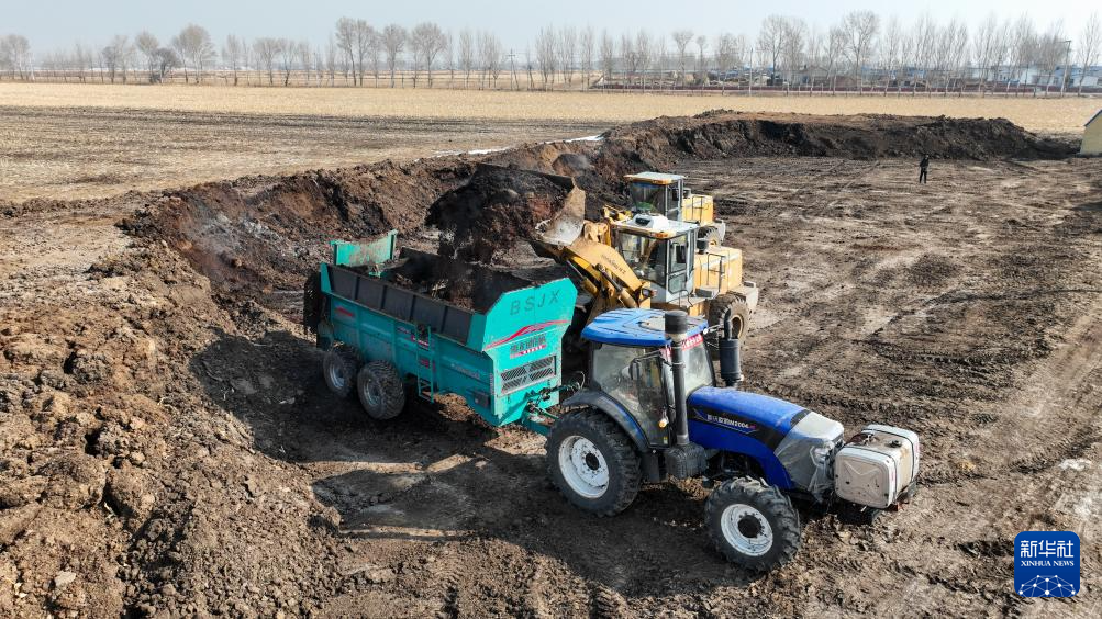 3月8日,农民驾驶农机在内蒙古兴安盟扎赉特旗音德尔镇巨宝村一处农田中装运有机肥(无人机照片)。