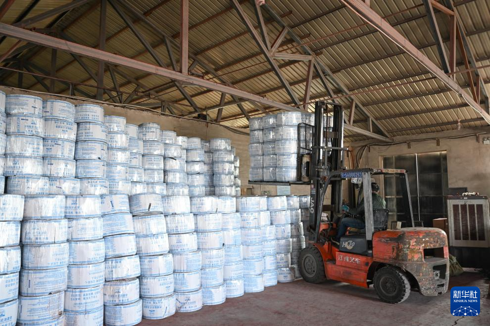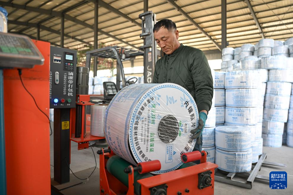3月8日,工人在内蒙古兴安盟扎赉特旗内蒙古鑫嘉立铭新材料科技有限公司生产车间打包滴灌带。