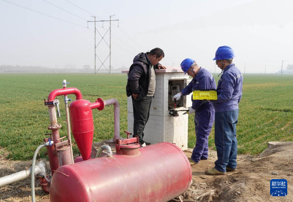 3月8日,国网邢台市南和区供电公司的工人在阎里乡阎里村的麦田帮助农民检修电力灌溉设备。