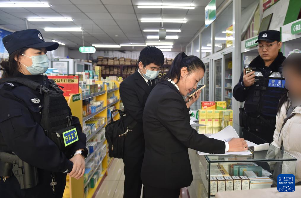 3月4日,在北京市海淀区一家药店,海淀区人民法院执行局法官刘莹(左三)与案件当事人电话沟通。