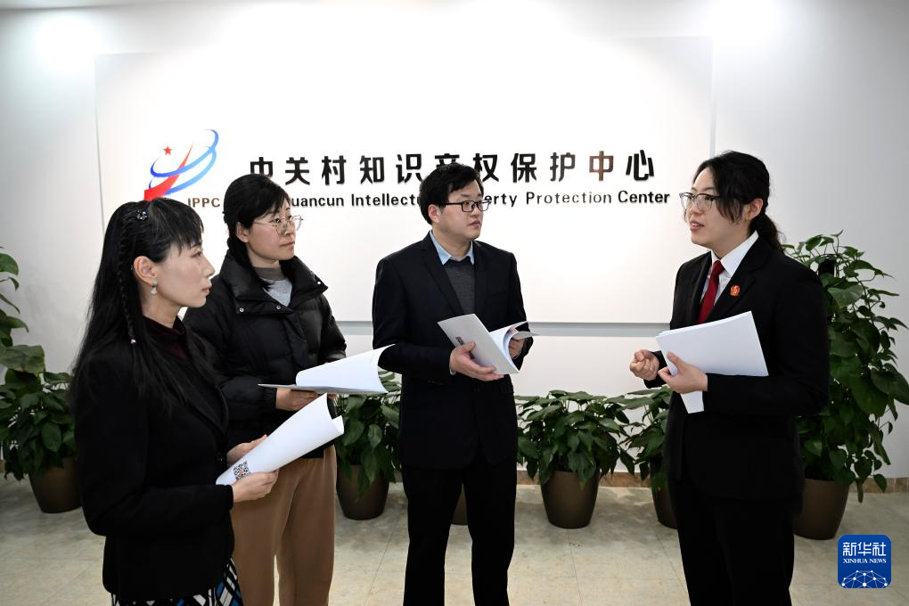3月7日,在北京市海淀区中关村知识产权保护中心,海淀区人民法院法官李思頔(右一)与该中心工作人员交流知识产权保护工作。