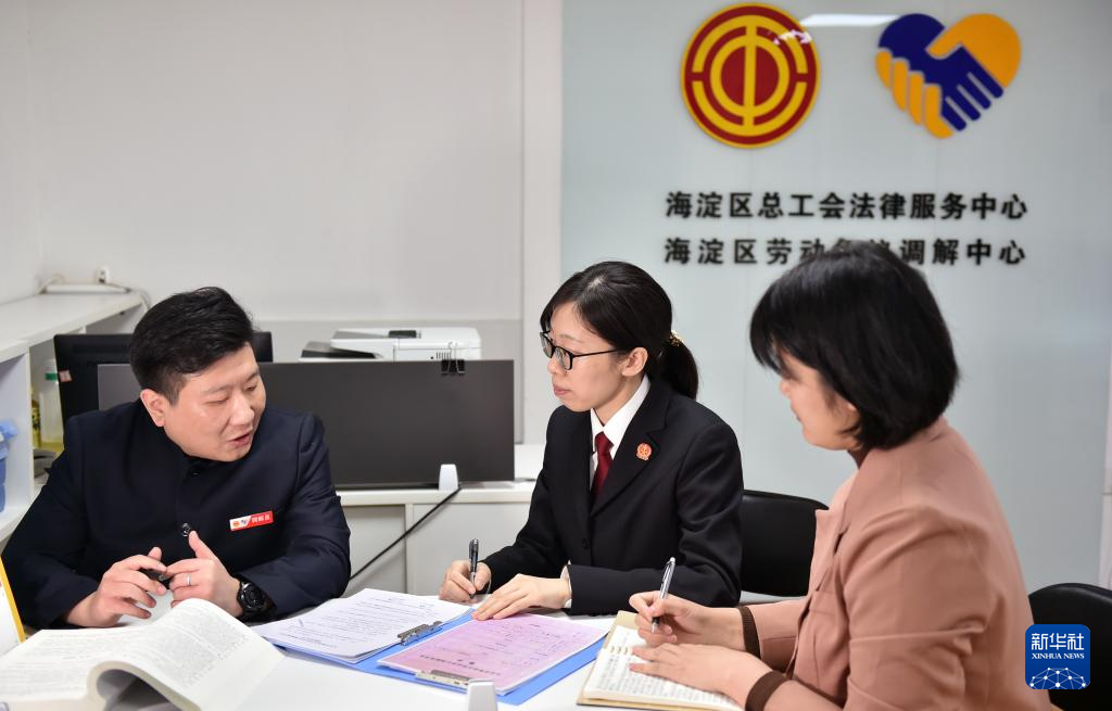 3月6日,在北京市海淀区总工会劳动争议调解中心,海淀区人民法院法官王琰(中)与该中心工作人员就纠纷化解情况进行沟通。