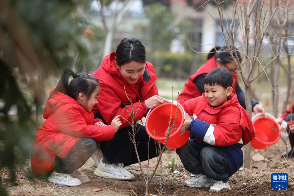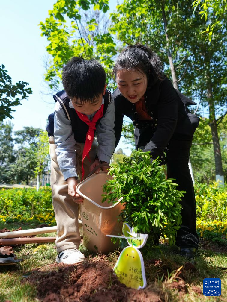 3月11日,在云南省昆明市盘龙区长青社区,学生和家长为刚种的树浇水。