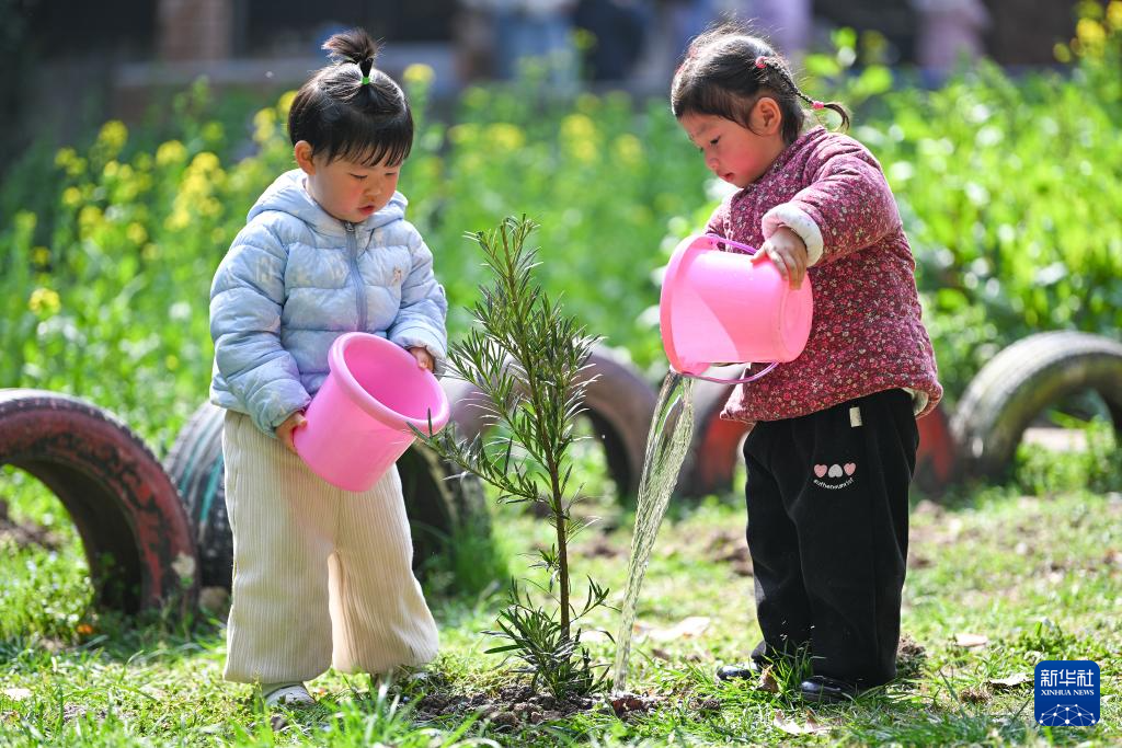 3月11日,江苏省南京市建邺区金地名京幼儿园的孩子们在校园里为树苗浇水。