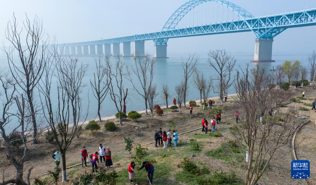 3月11日,在江苏省南通市通州区平潮镇,志愿者在长江岸边植树(无人机照片)。