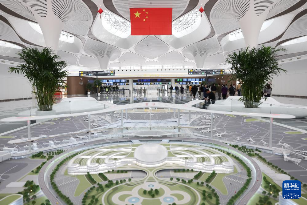 这是在兰州中川国际机场T3航站楼出发大厅拍摄的T3航站楼和综合交通中心沙盘模型(3月11日摄)。