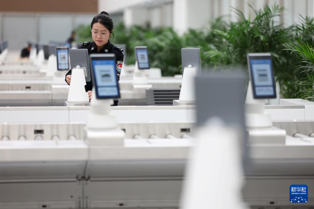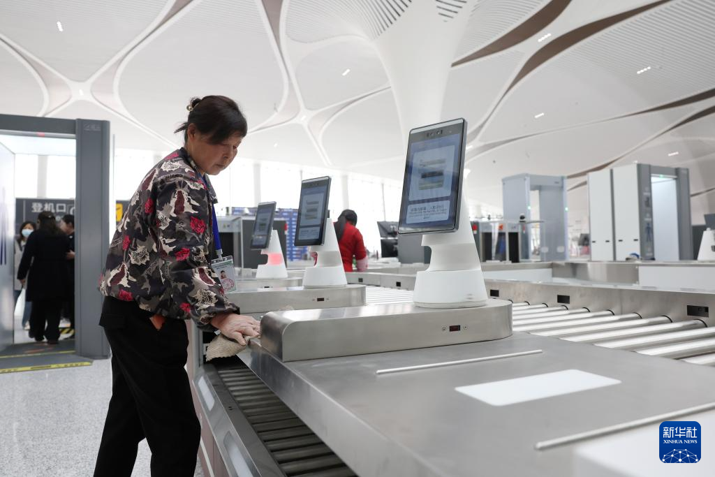 3月11日,兰州中川国际机场安检员姚宝珍在T3航站楼安检区域检查设备运行情况。