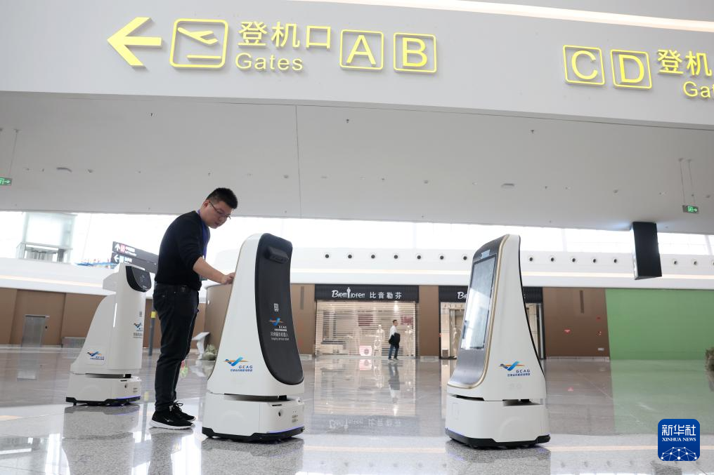 3月11日,技术人员在兰州中川国际机场T3航站楼候机区域对机器人进行调试检查。