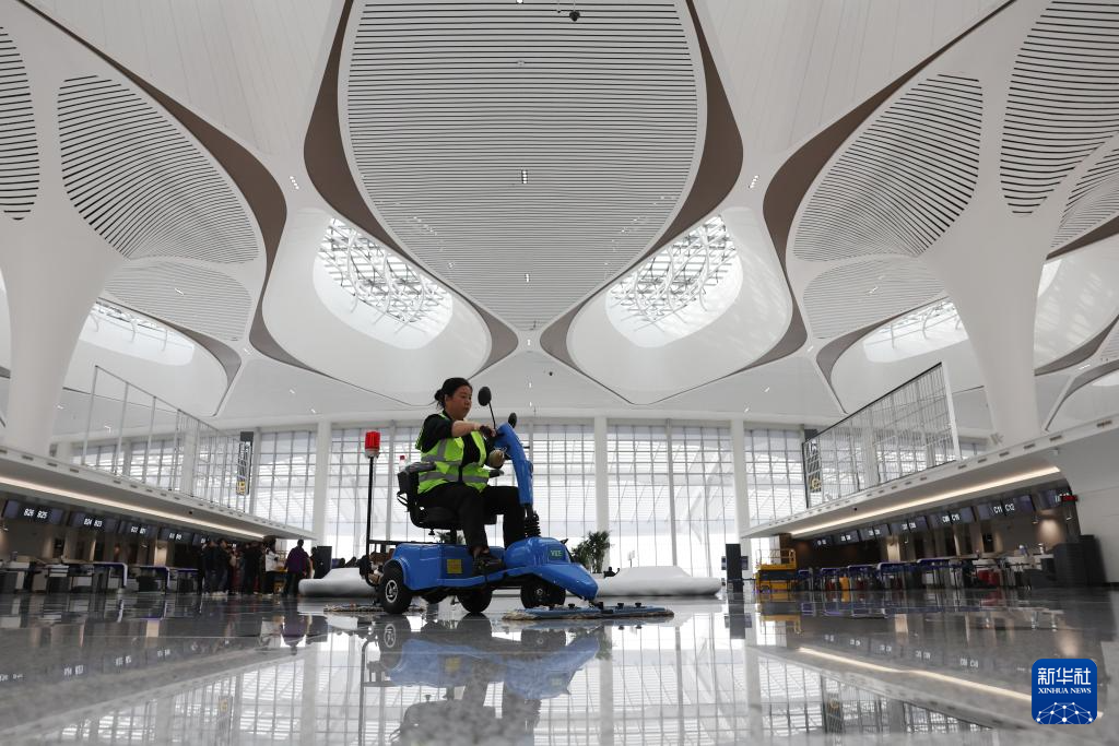3月11日,保洁人员在兰州中川国际机场T3航站楼候机区域进行保洁工作。