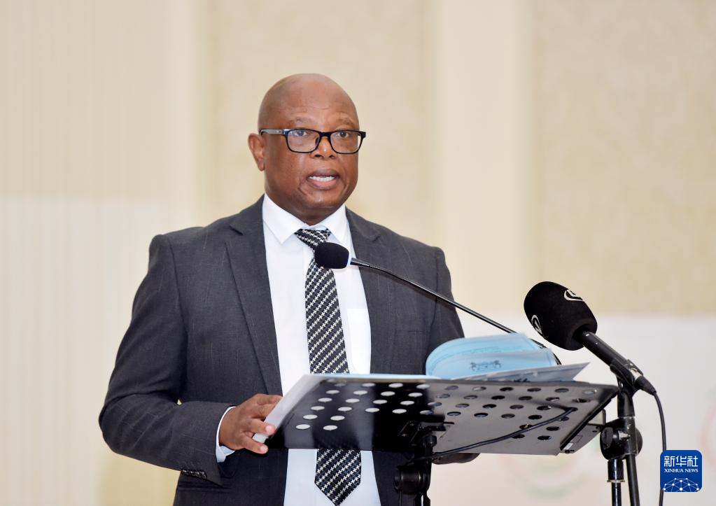 3月11日,博茨瓦纳环境和旅游部长温特·莫洛齐在哈博罗内举行的博茨瓦纳可持续野生动物管理项目法律中心揭牌仪式上致辞。