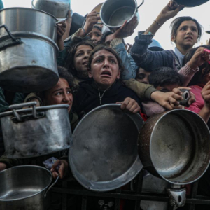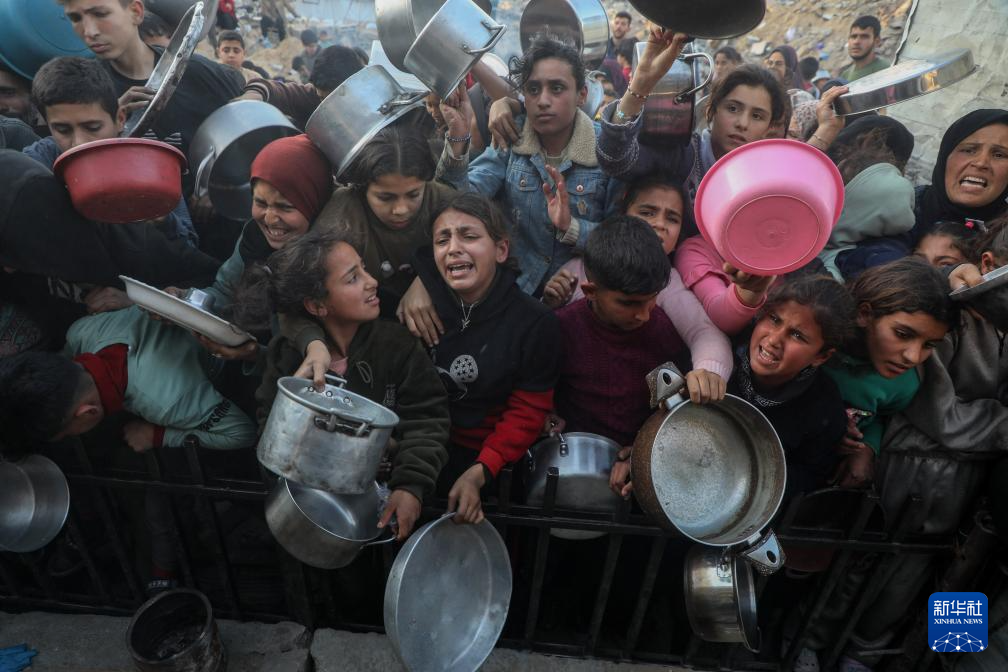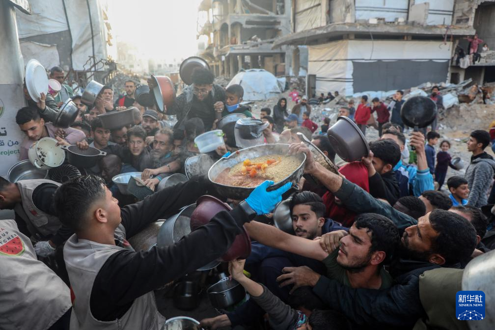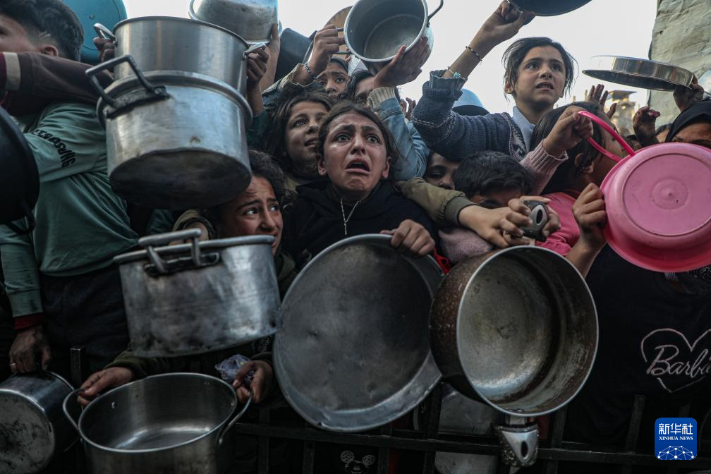3月11日,在加沙地带杰巴利耶难民营一个“慈善厨房”,人们等候领取救济食物。