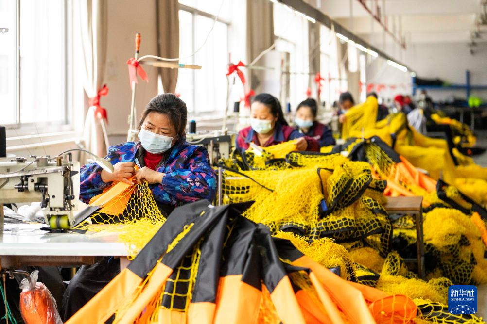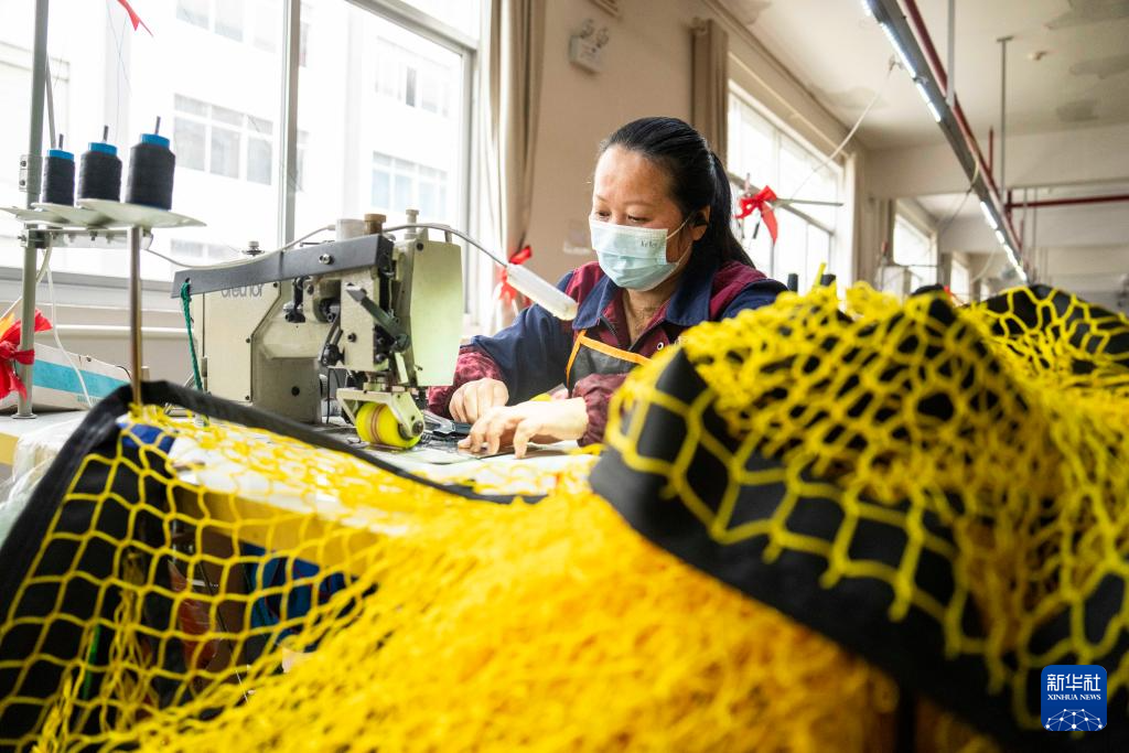 3月12日,在位于沅江高新区的湖南星海运动用品有限公司,工人在制作球网。