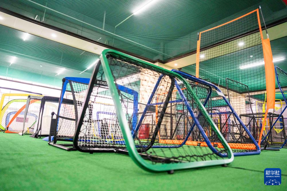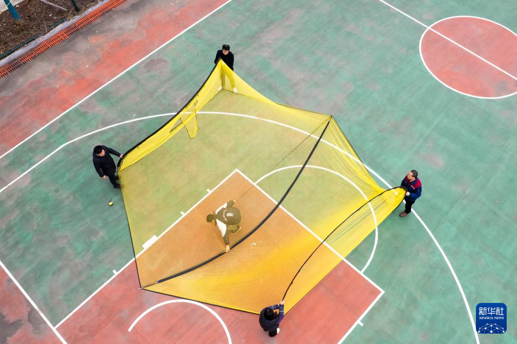 3月11日,在位于沅江高新区的湖南星海运动用品有限公司,工人在测试一款新研发的高尔夫打击网(无人机照片)。