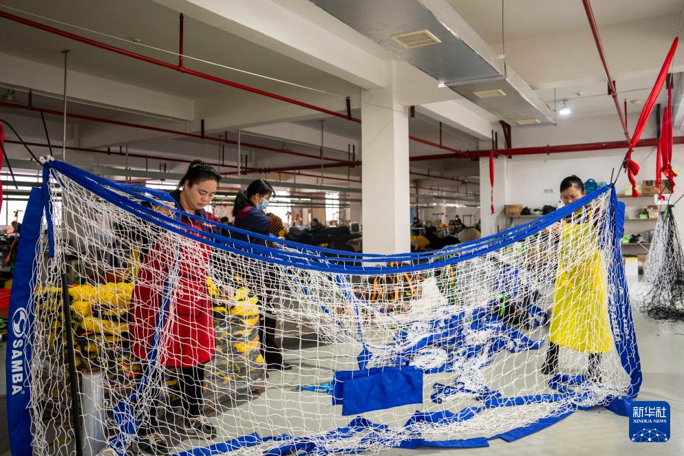 3月12日,在位于沅江高新区的湖南星海运动用品有限公司,工人在组装球网。