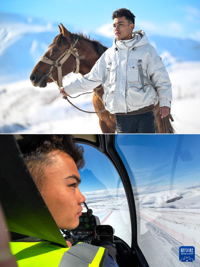 这是一张拼版照片,上图为:在新疆伊犁哈萨克自治州新源县,米尔别克·特留别克工作之余牵着马漫步在那拉提景区(3月10日摄);下图为:在新疆伊犁哈萨克自治州新源县那拉提景区上空,米尔别克·特留别克驾驶直升机做针对性飞行训练(3月5日摄)。