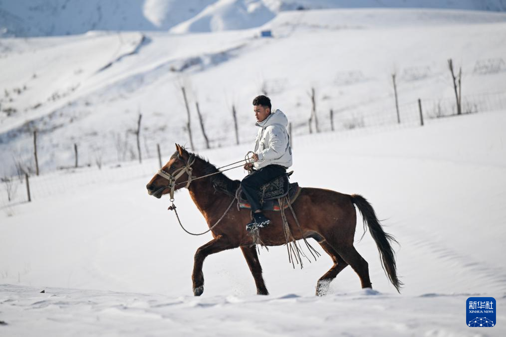 在新疆伊犁哈萨克自治州新源县,米尔别克·特留别克工作之余骑马漫步在那拉提景区(3月10日摄)。