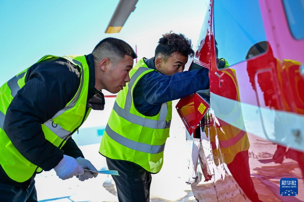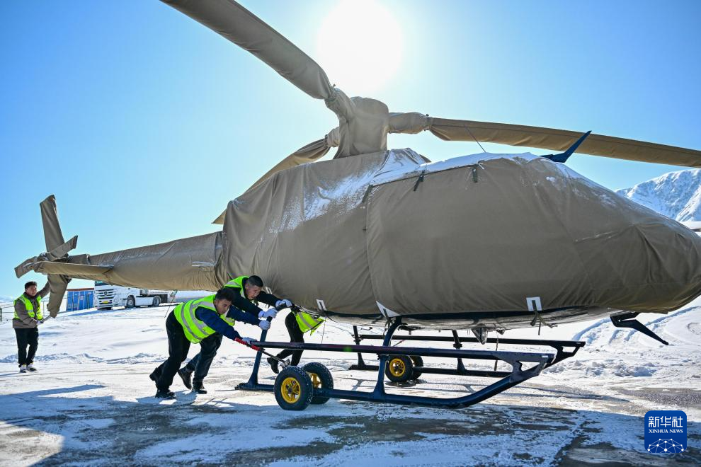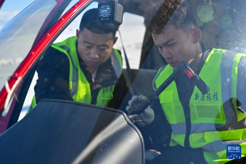 在新疆那拉提羽泊通用航空有限责任公司直升机起降点,米尔别克·特留别克(右)和机务人员在飞行前检查机上设备(3月5日摄)。