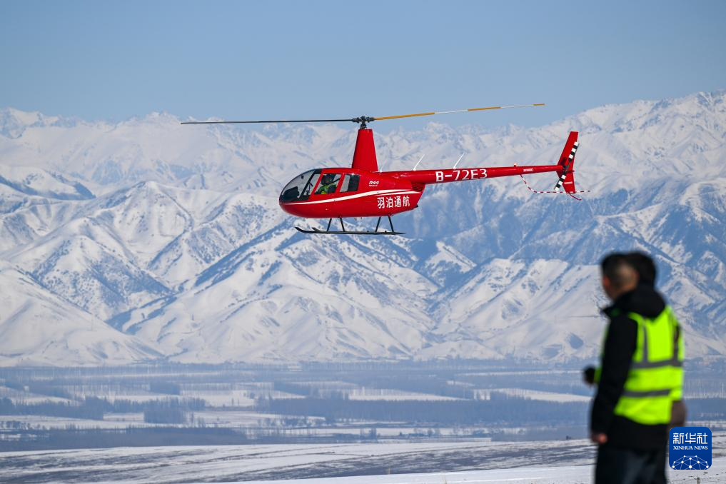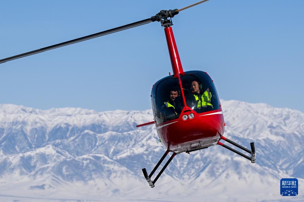 在新疆那拉提羽泊通用航空有限责任公司直升机起降点,米尔别克·特留别克完成针对性飞行训练(3月5日摄)。